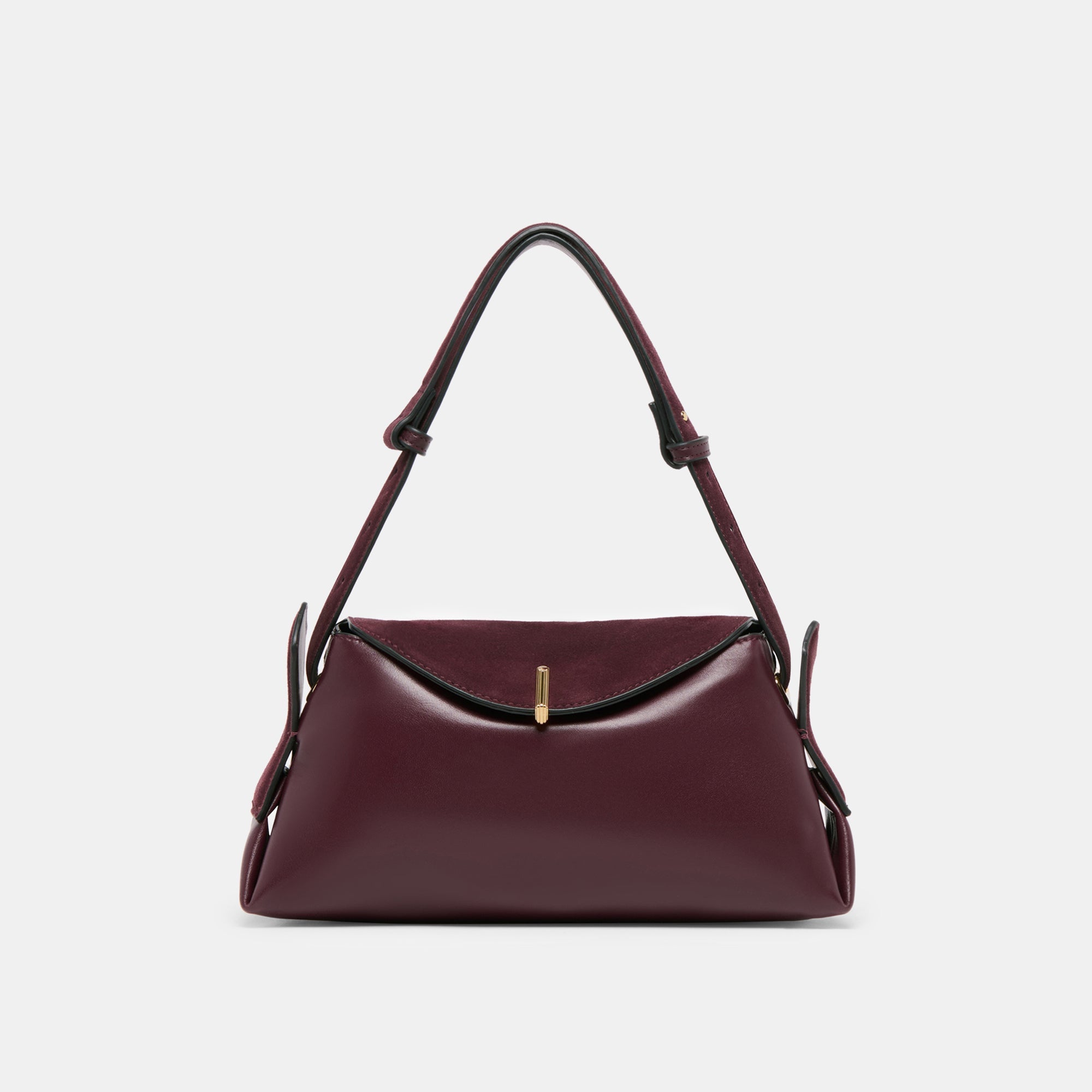 DEVYN is sharp and sophisticated. This leather shoulder bag features a magnetic flap closure with a touch of gold metal detailing. a knotted strap. and one sleek silhouette. Take this timeless bag out day or night in classic black. chic espresso. or bold burgundy.