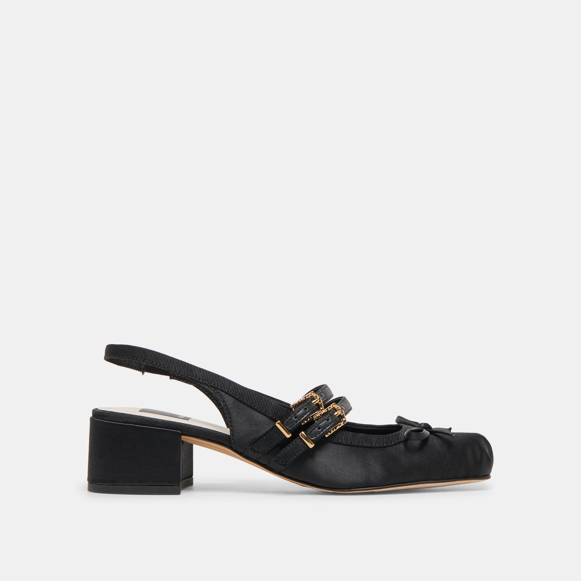 LORIS combines the look of an authentic ballet flat with a retro silhouette. This satin slingback's low block heel is comfortable for all day wear while her double mary-jane strap and delicate bow add a vintage-inspired touch.Â